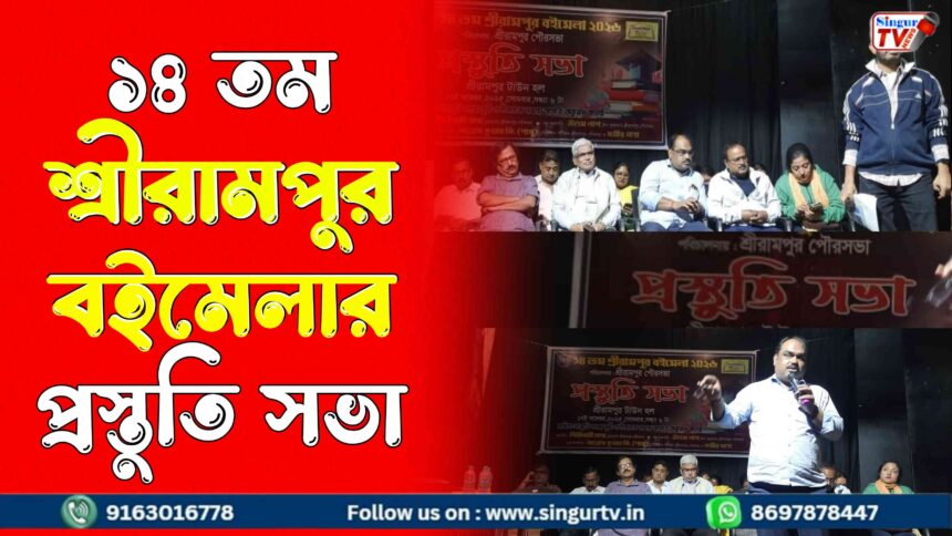 সিঙ্গুর টিভি নিউজ ওয়েভডেস্ক, শ্রীরামপুর, হুগলী : শ্রীরামপুর টাউন হলে সোমবার ১৭ই নভেম্বর ২০২৫ অনুষ্ঠিত হয়ে গেলো ১৪তম শ্রীরামপুর বইমেলার প্রস্তুতি সভা । হুগলীর শ্রীরামপুর পৌরসভার পরিচালনায় অনুষ্ঠিত এই বইমেলার জন্য সারা বছর অপেক্ষায় থাকেন শ্রীরামপুরবাসী।