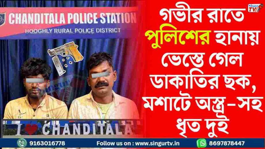 ডাকাতির ছক কষার আগেই ভেস্তে গেল পরিকল্পনা। গোপন সূত্রে খবর পেয়ে শুক্রবার গভীর রাতে চণ্ডীতলা থানার অন্তর্গত মশাট এলাকায় অভিযান চালিয়ে দুই দুষ্কৃতিকে গ্রেফতার করল পুলিশ।