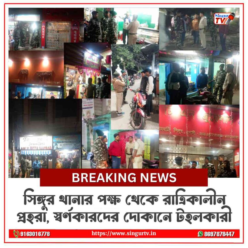 শনিবার ২২ নভেম্বর ২০২৫ এ সিঙ্গুরের একাধিক জায়গায় সোনার দোকানদারদের ও বাজারের অন্যান্য দোকানের নিরাপত্তা সুনিশ্চিত করার জন্য সিঙ্গুর থানার পুলিশ বিভিন্ন বাজারে ঘুরছে এবং দোকানদারদের সাথে সেই সব বিষয় নিয়ে আলোচনা করছে।