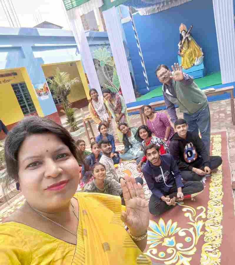 সরস্বতী পুজো উপলক্ষে উৎসবের আনন্দে একসঙ্গে সেলফি তুললেন শিক্ষিকা ও পড়ুয়ারা।