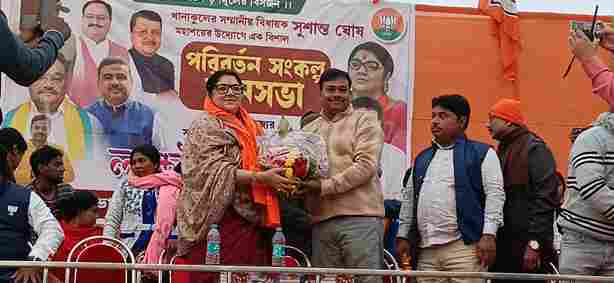 সভায় সবচেয়ে আলোচিত মুহূর্ত আসে মঞ্চে, যখন খানাকুলের বিধায়ক সুশান্ত ঘোষ হুগলীর প্রাক্তন সাংসদ লকেট চ্যাটার্জীকে আনুষ্ঠানিকভাবে বরণ করে নেন।