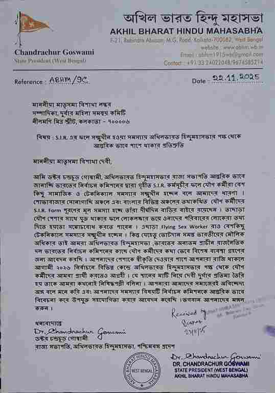 এস.আই.আর কর্মসূচিতে যৌণকর্মীদের জন্য বিশেষ সুবিধার দাবীতে নির্বাচন কমিশনে হিন্দুমহাসভা